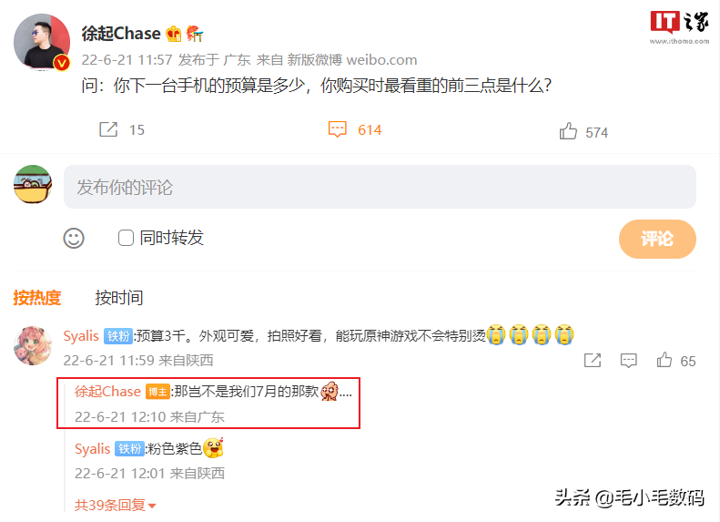 近日,realme 副縂裁、全球營銷縂裁、中國區縂裁徐起詢問網友“下一台手機的預算”等信息,其中一位網友表示“預算 3 千,外觀可愛,拍照好看,能玩原神遊戯不會特別燙”,徐起廻複稱“那豈不是我們 7 月的那款”。