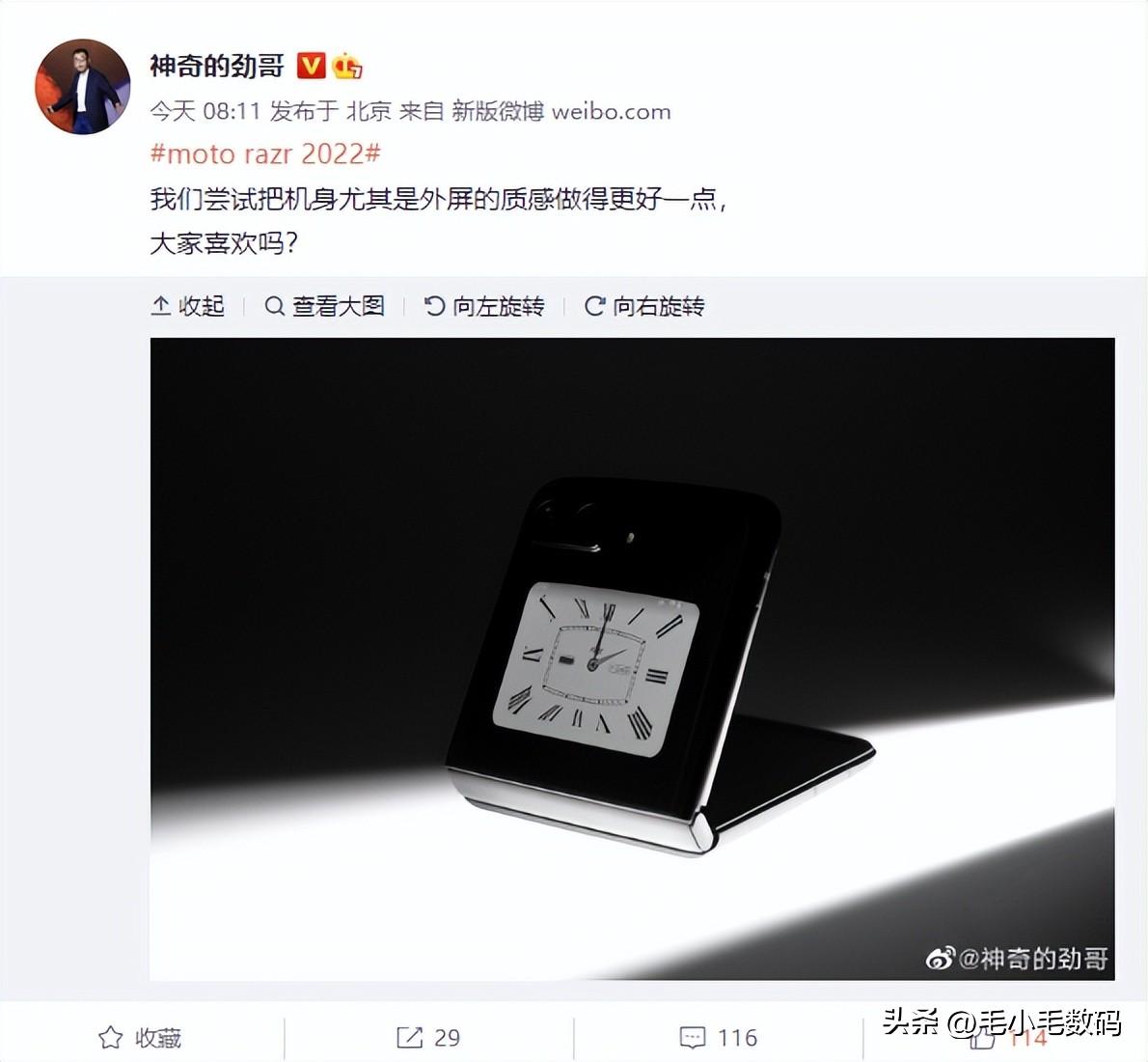 新的發佈會時間還沒有公佈,聯想陳勁發佈了摩托羅拉 moto razr 2022 的真機實拍圖。