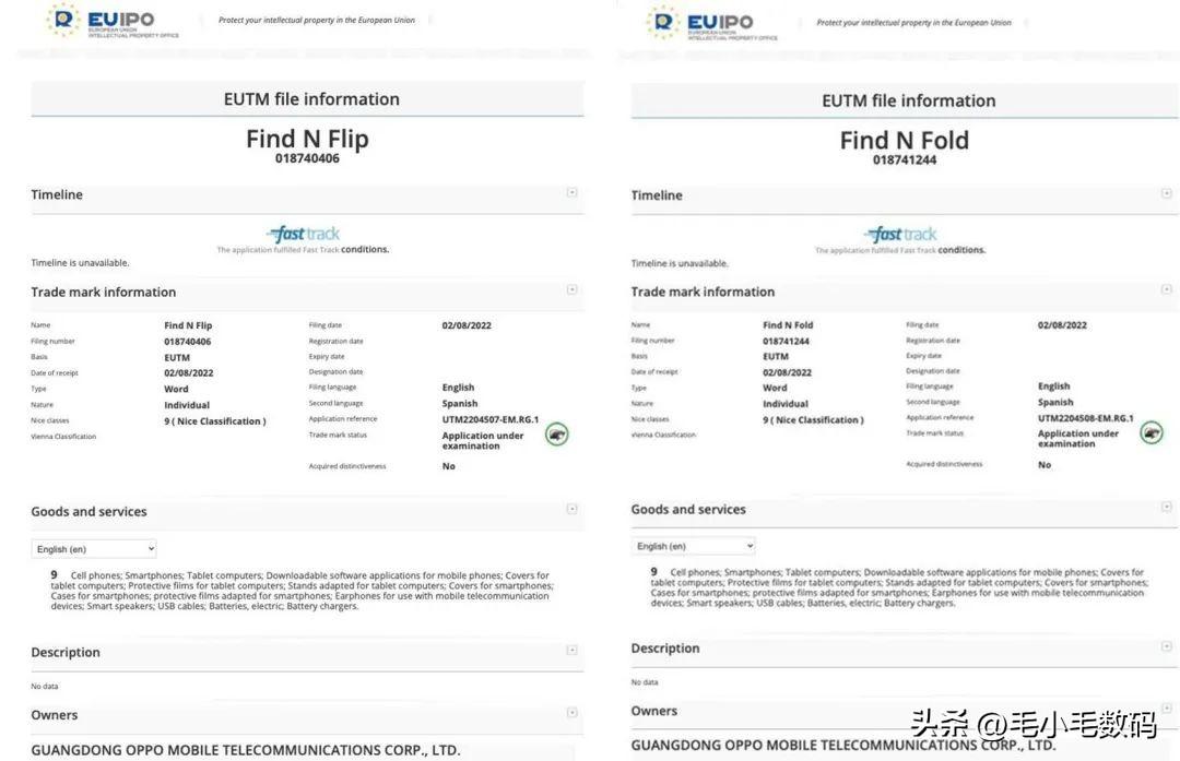OPPO Find N Flip 申請號爲 0187404406,而 Find N Fold 申請號爲 018741244,這兩款手機的 EUIPO 商標已於 2022 年 8 月 2 日提交。