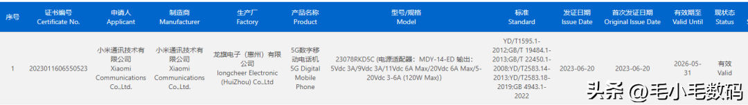 近日,一款型號爲23078RKD5C的小米新機通過了3C質量認証。據悉,該機正是Redmi K60系列中尚未露麪的超大盃Redmi K60 Ultra。