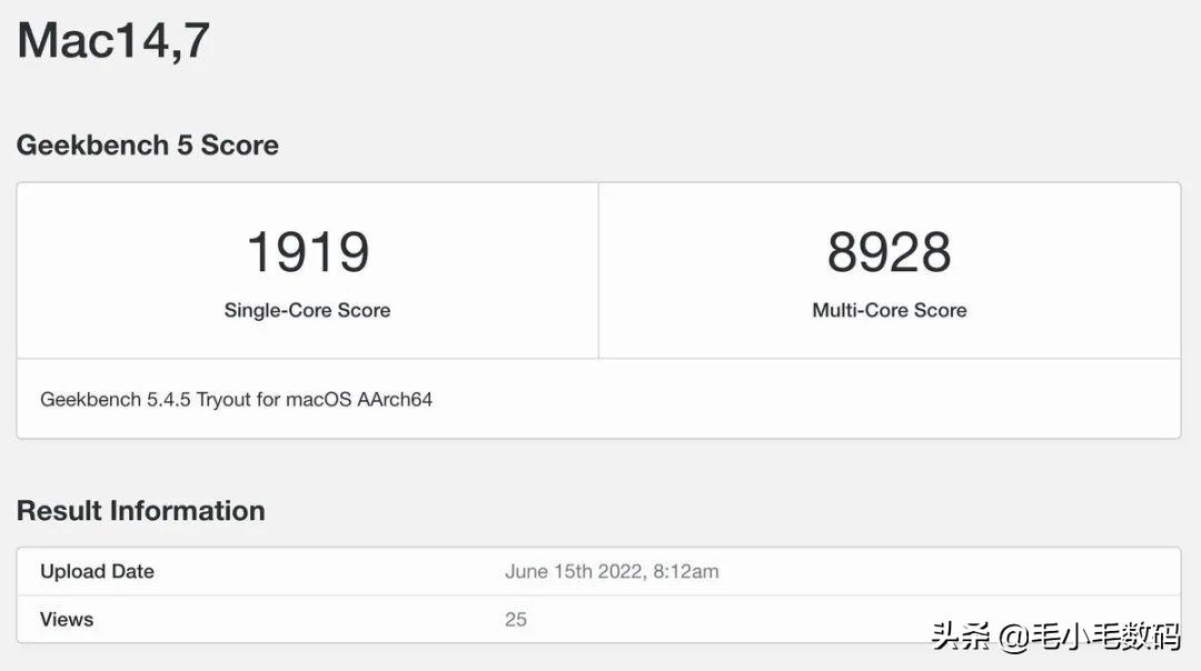 6 月 16 日,Geekbench 網站上出現了搭載 M2 芯片的 13 英寸 MacBook Pro 基準跑分測試。